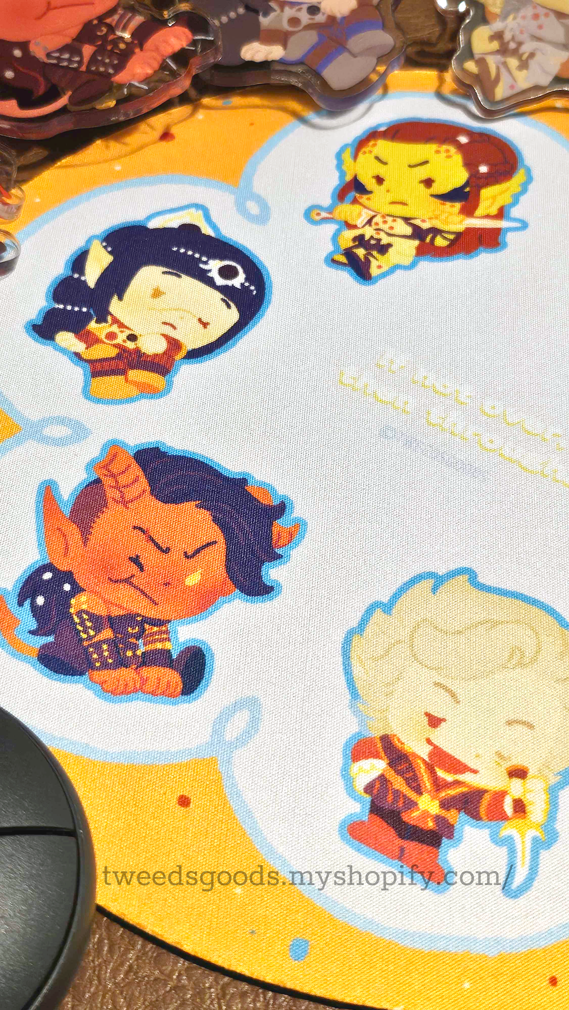 Round travel-friendly mousepad of the BG3 Companions with the text " If not over, then through written on it."
