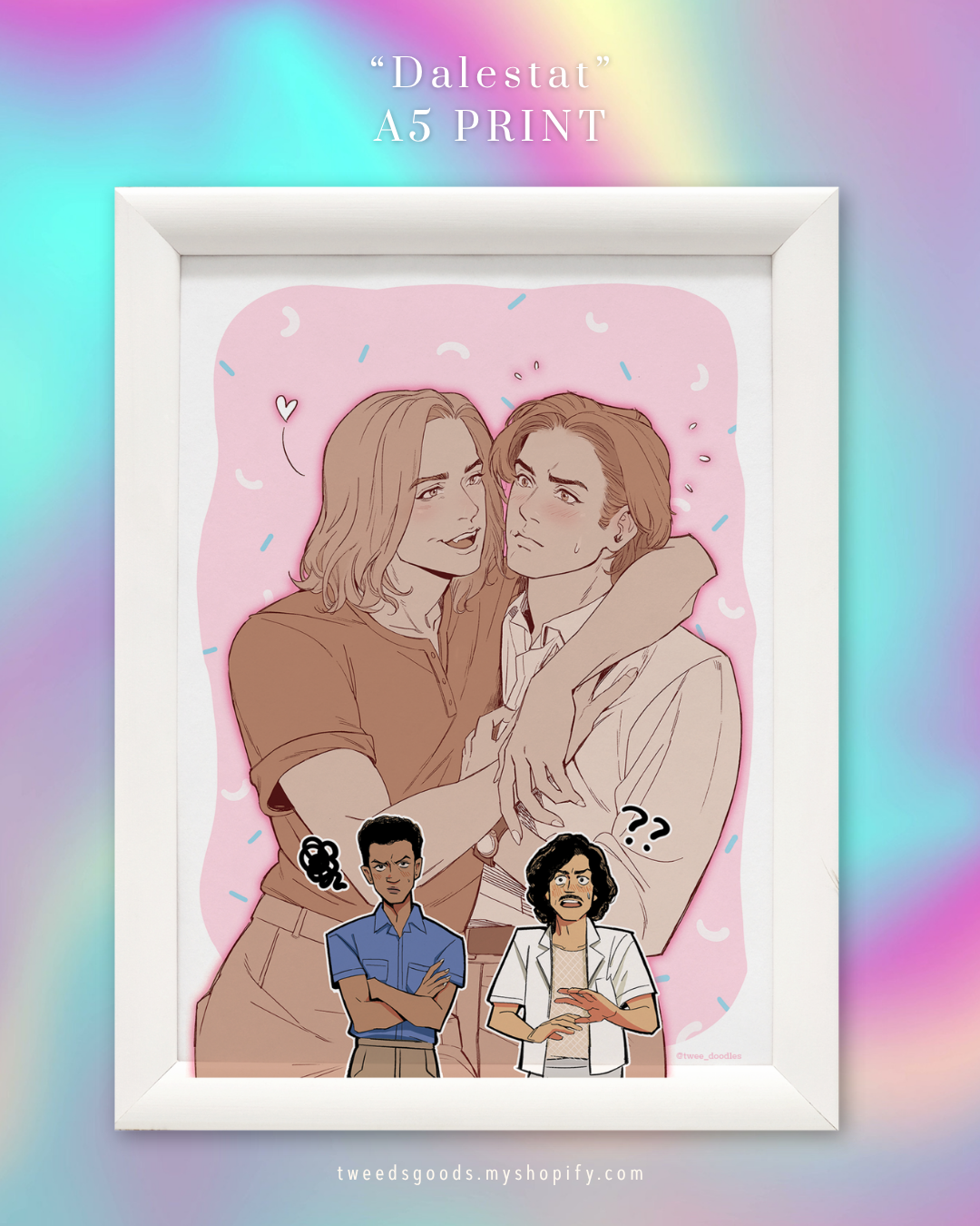 Gloss-laminated print of a scrapped crossover episode of the Newsreader Interview with the Vampire that 100% happened. Featuring Tim, Dale, Louis, and Lestat. ( Inspired by a Ao3 fic from exquisitetragicthing )
